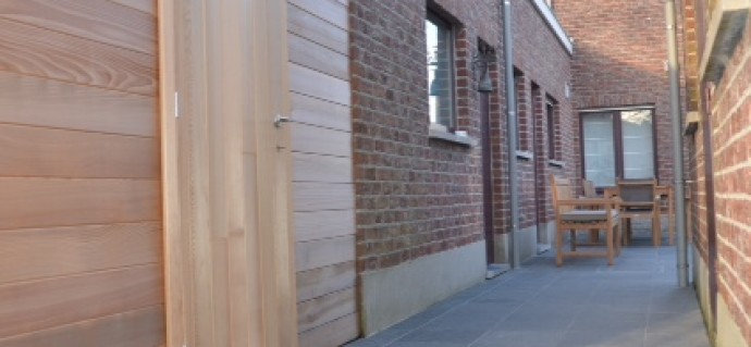 Het terras vormt de verbinding tussen de woning en de tuin. Het behoort niet helemaal tot het huis maar maakt ook niet echt deel uit van de tuin. U kan er genieten van de zon of juist van de schaduw. Een heerlijk uitzicht op de tuin, genieten van de vissen in de vijver of de rijkelijke bloeiende border. Het is de bevoorrechte plek om te ontspannen, vrienden te ontvangen of om in de zomer culinair te genieten.